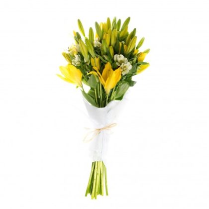DEDICADOSDiseño Alargado, 5 varas de Crisantemo Spider y ramas amarillas.